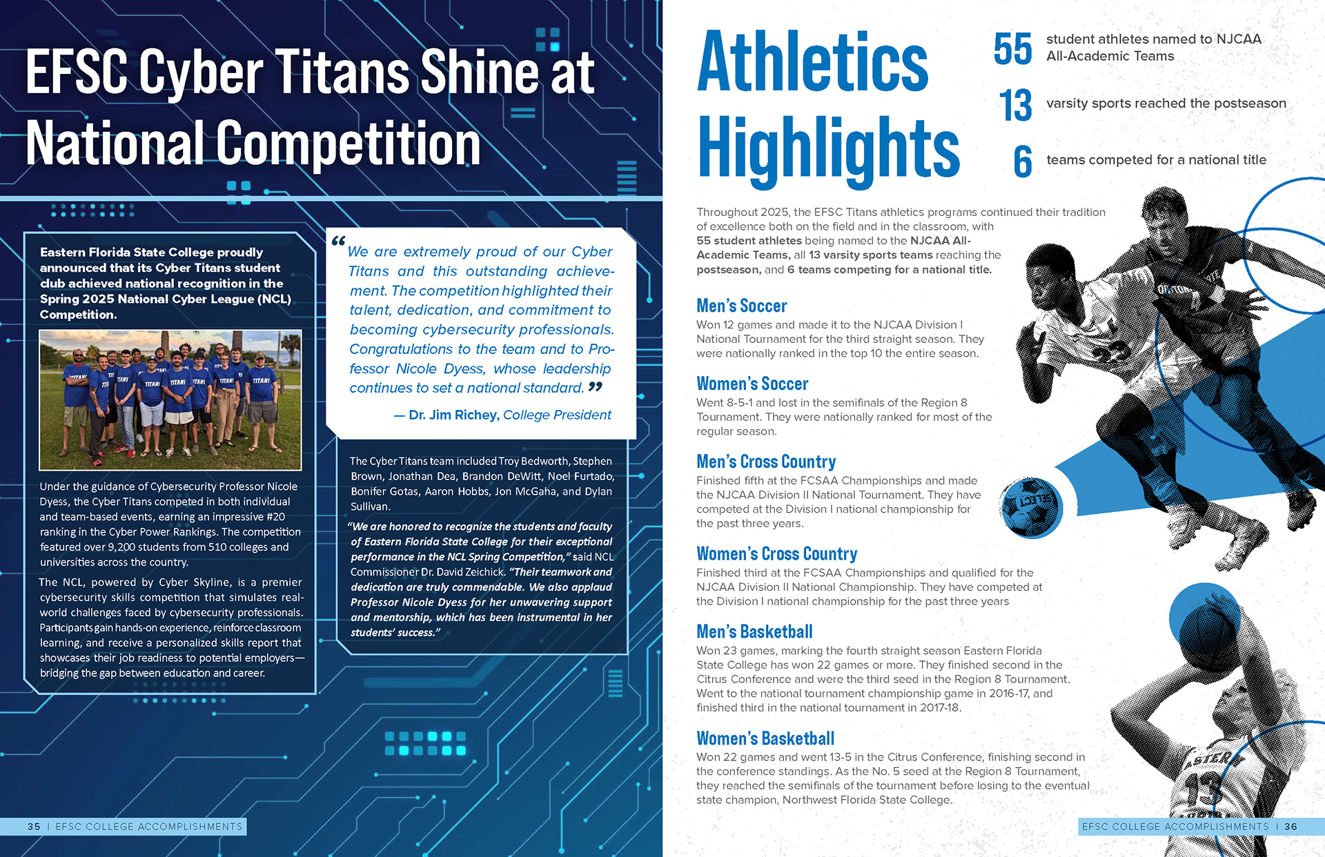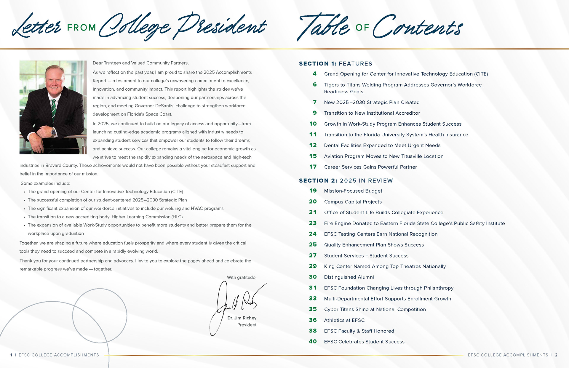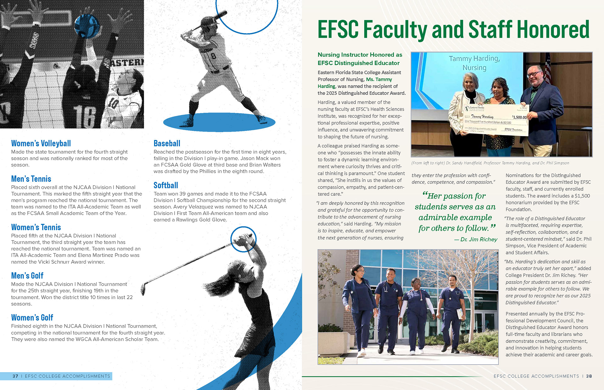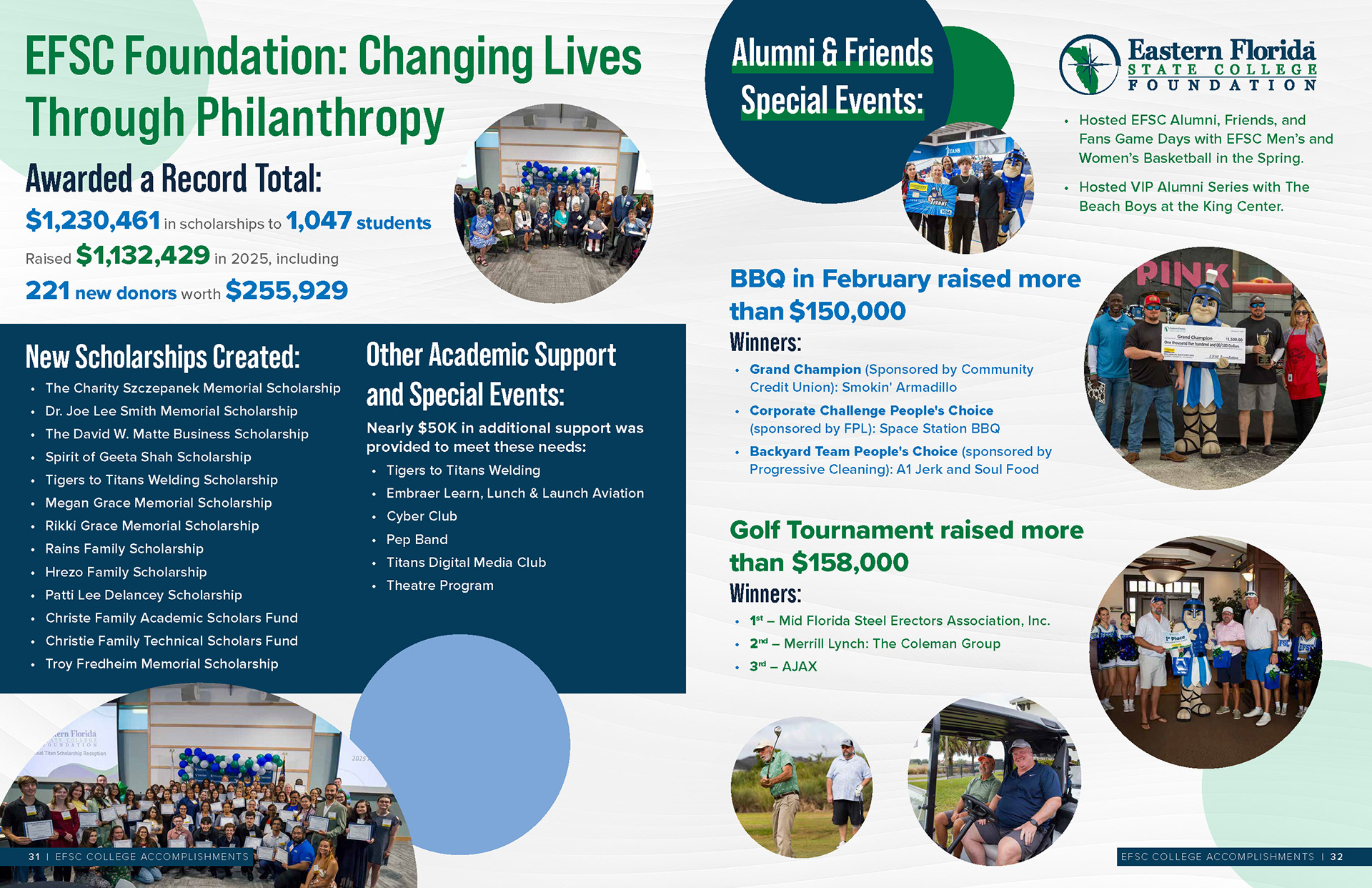 Every year, Eastern Florida State College shares its accomplishments and highlights for the year in an annual report. Staff, faculty, and student achievements show how the College has grown and what it continues to aim to do in the community. To view the entire booklet online, visit: https://viewer.joomag.com/efsc-college-accomplishments-2025/0516441001769633492